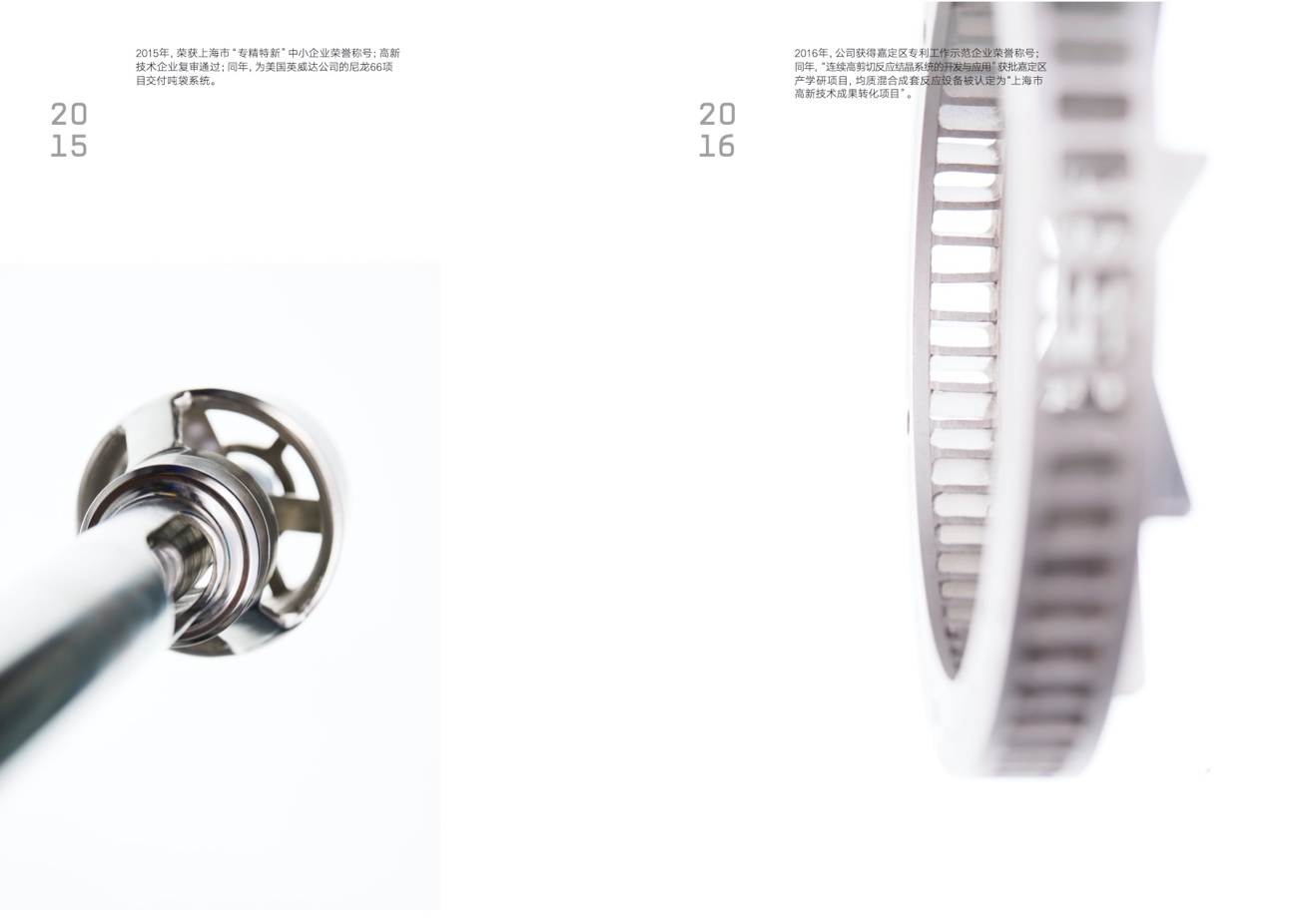 20162016年,公司獲得嘉定區專利工作示範企業榮譽稱号。同年,“連續高剪切反應結晶系統的開發與應用”獲批嘉定區産學研項目,均質混合成套反應設備被認定爲“上海市高新技術成果轉化項目”;