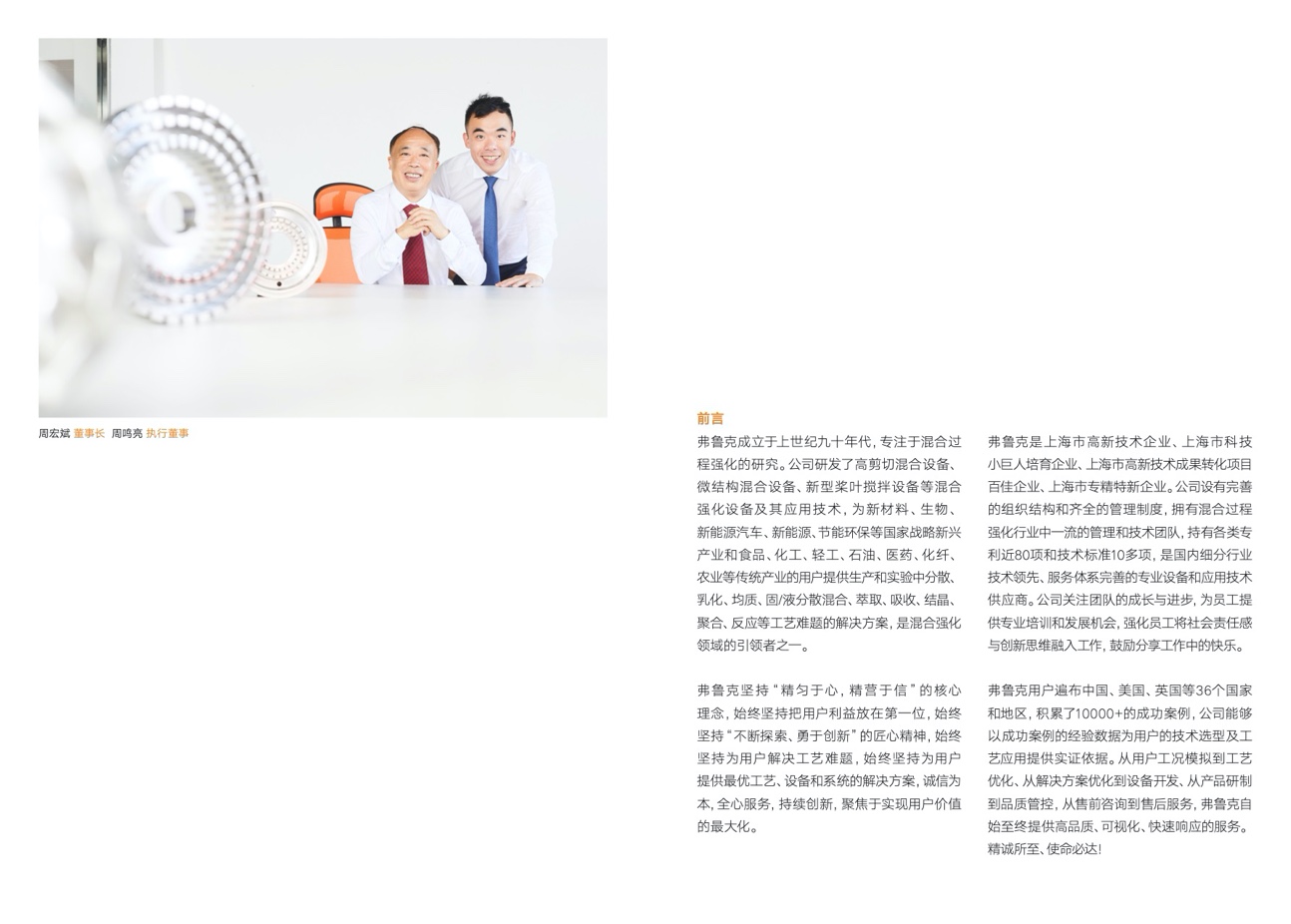 弗魯克是上海市高新技術企業、上海市科技小巨人培育企業、上海市高新技術成果轉化項目百佳企業、上海市專精特新企業。公司設有完善的組織結構和齊全的管理制度,擁有混合過程強化行業中一流的管理和技術團隊,持有各類專利近80項和技術标準10多項,是國内細分行業技術領先、服務體系完善的專業設備和應用技術供應商。公司關注團隊的成長與進步,爲員工提供專業培訓和發展機會,強化員工将社會責任感與創新思維融入工作,鼓勵分享工作中的快樂。